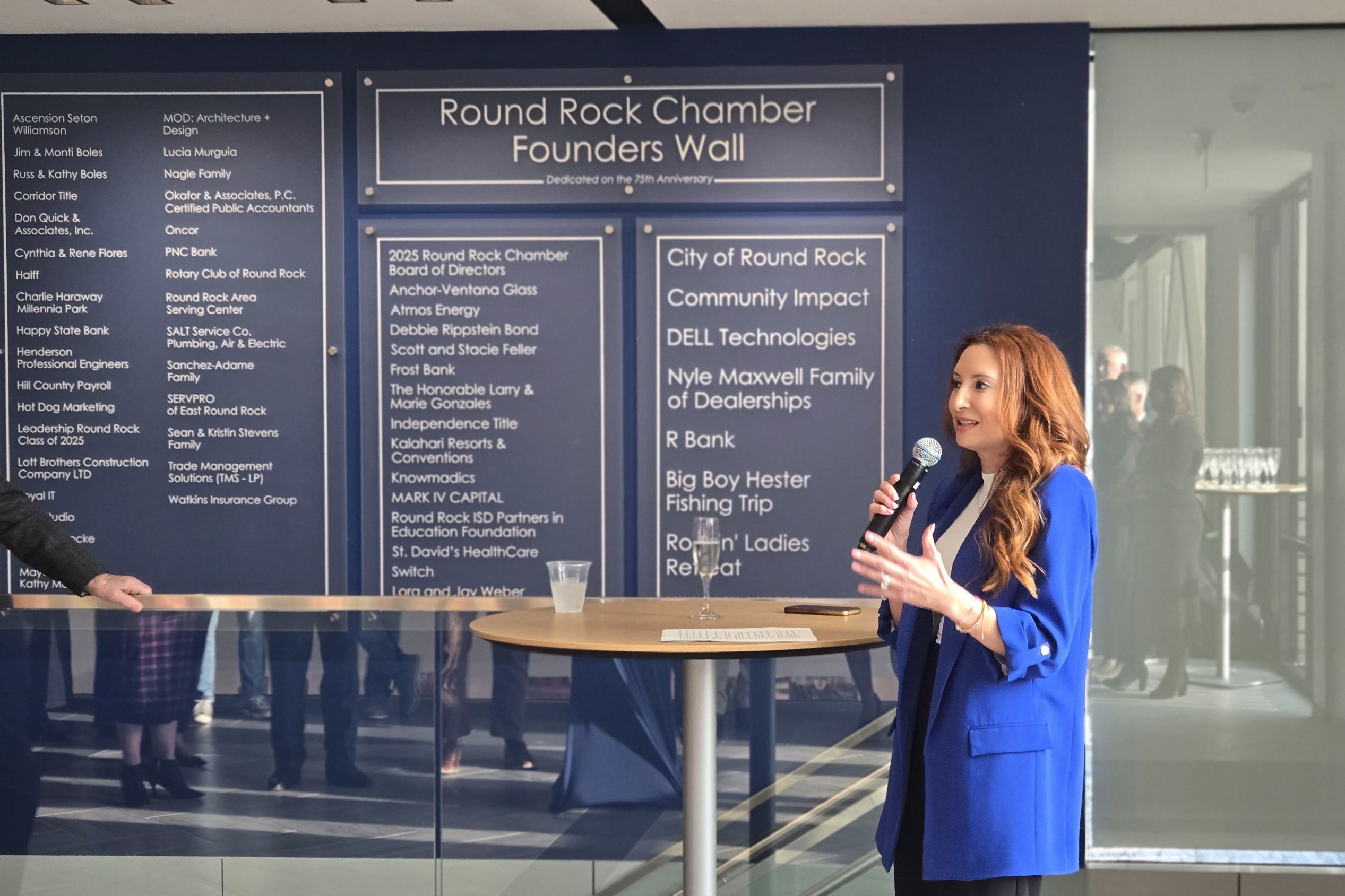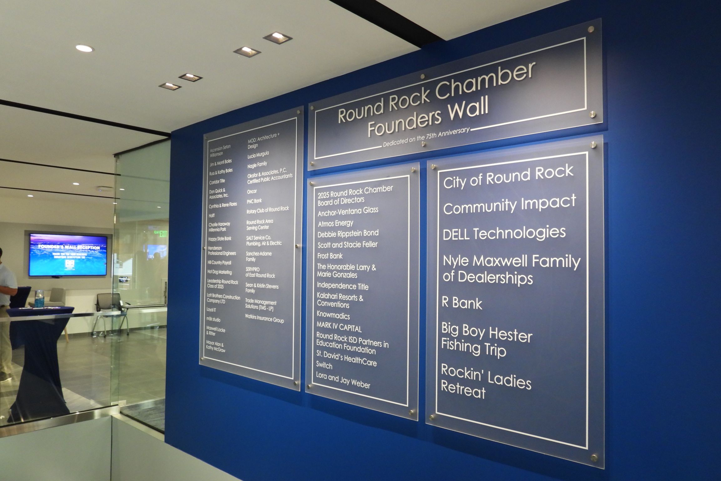 The Founder’s Wall Campaign was launched in honor of the Chamber’s 75-year milestone and designed to recognize early supporters of the Round Rock Chamber Foundation, a 501(c)3 nonprofit launched in 2025. The wall honors the businesses, families, and civic leaders who invested in the mission to build a stronger, more vibrant future for Round Rock.